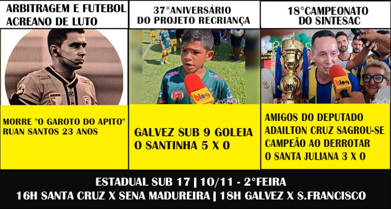 Campeonato Sub-20 ARBITRAGEM E FUTEBOL ACREANO DE LUTO. MORRE”O GAROTO DO APITO” RUAN SANTOS 23 ANOS,FUTURO ADVOGADO Confira 10 de novembro de 2025