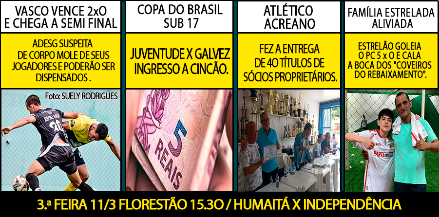 VASCO VENCE 2xO E CHEGA A SEMI FINAL. ADESG SUSPEITA DE CORPO MOLE DE SEUS JOGADORES E PODERÃO SER DISPENSADOS. COPA DO BRASIL SUB 17. JUVENTUDE X GALVEZ INGRESSO A CINCÃO. ATLÉTICO ACREANO. FEZ A ENTREGA DE 4O TÍTULOS DE SÓCIOS PROPRIETÁRIOS. FAMÍLIA ESTRELADA ALIVIADA. ESTRELÃO GOLEIA O PC 5 x O E CALA A…