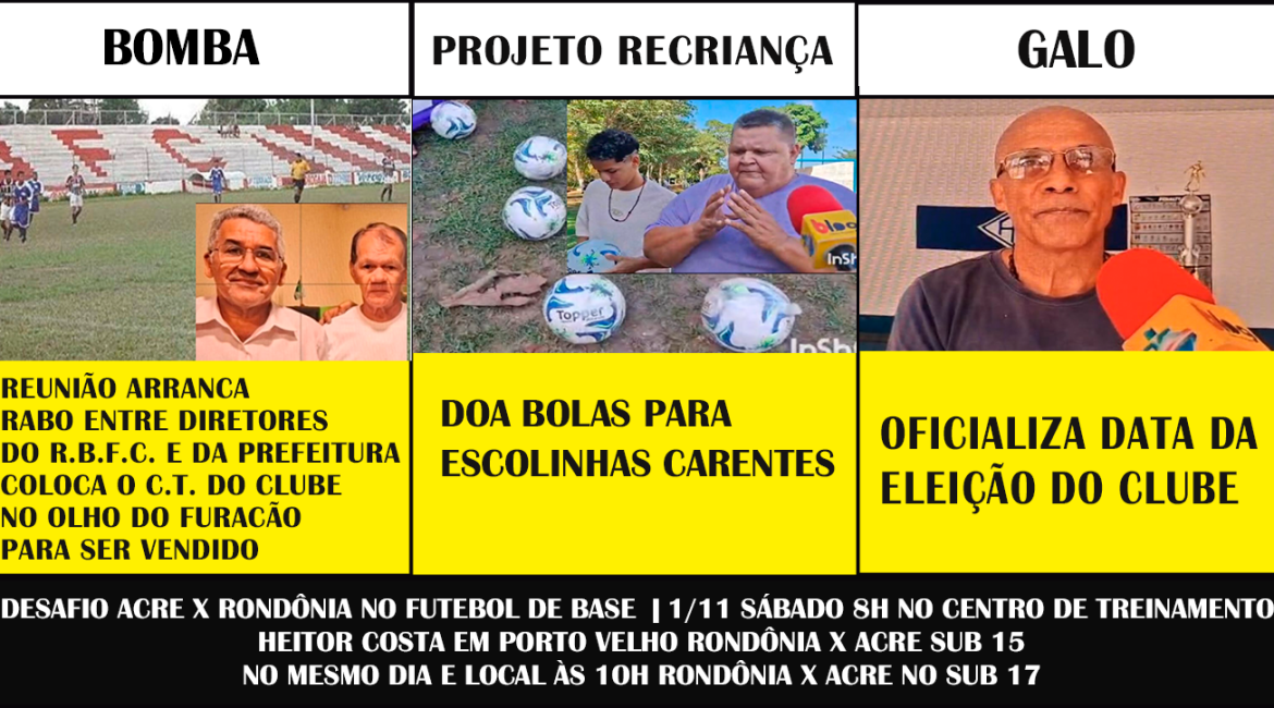 BOMBA!! REUNIÃO ARRANCA RABO ENTRE DIRETORES DO R.B.F.C. E DA PREFEITURA COLOCA O C.T. DO CLUBE NO OLHO DO FURACÃO PARA SER VENDIDO PROJETO RECRIANÇA DOA BOLAS PARA ESCOLINHAS CARENTES GALO OFICIALIZA DATA DA ELEIÇÃO DO CLUBE