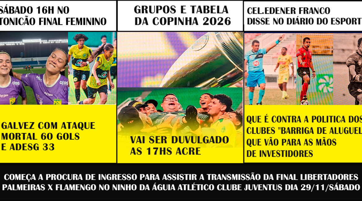 SÁBADO 16H NO TONICÃO FINAL FEMININO GALVEZ COM ATAQUE MORTAL 6O GOLS E ADESG 33 GRUPOS E TABELA DA COPINHA 2O26 VAI SER DUVULGADO AS 17HS ACRE CEL. EDENER FRANCO DISSE NO DIÁRIO DO ESPORTE QUE É CONTRA A POLITICA DOS CLUBES “BARRIGA DE ALUGUEL” QUE VÃO PARA AS MÃOS DE INVESTIDORES