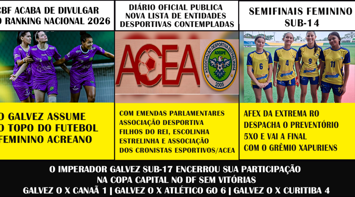 CBF ACABA DE DIVULGAR O RANKING NACIONAL 2O26 O GALVEZ ASSUME O TOPO DO FUTEBOL FEMININO ACREANO DIÁRIO OFICIAL PUBLICA NOVA LISTA DE ENTIDADES DESPORTIVAS CONTEMPLADAS COM EMENDAS PARLAMENTARES, ASSOCIAÇÃO DESPORTIVA FILHOS DO REI, ESCOLINHA ESTRELINHA E ASSOCIAÇÃO DOS CRONISTAS ESPORTIVOS/ACEA SEMIFINAIS FEMININO SUB-14 AFEX DA EXTREMA RO DESPACHA O PREVENTÓRIO 5XO E VAI…