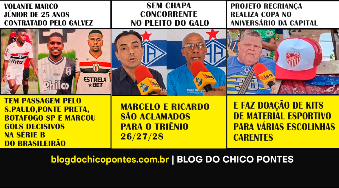 VOLANTE MARCO JÚNIOR DE 25 ANOS CONTRATADO PELO GALVEZ TEM PASSAGEM PELO S.PAULO,PONTE PRETA,BOTAFOGO SP E MARCOU GOLS DECISIVOS NA SÉRIE B DO BRASILEIRÃO SEM CHAPA CONCORRENTE NO PLEITO DO GALO, MARCELO E RICARDO SÃO ACLAMADOS PARA O TRIÊNIO 26/27/28 PROJETO RECRIANÇA REALIZA COPA NO ANIVERSÁRIO DA CAPITAL E FAZ DOAÇÃO DE KITS…