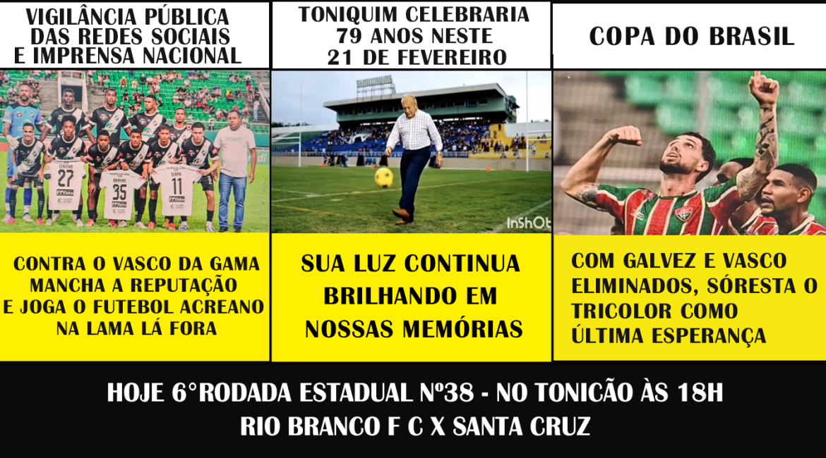 VIGILÂNCIA PÚBLICA DAS REDES SOCIAIS E IMPRENSA NACIONAL CONTRA O VASCO DA GAMA, MANCHA A REPUTAÇÃO E JOGA O FUTEBOL ACREANO NA LAMA LÁ FORA TONIQUIM CELEBRARIA 79 ANOS NESTE 21 DE FEVEREIRO, SUA LUZ CONTINUA BRILHANDO EM NOSSAS MEMÓRIAS COPA DO BRASILCOM GALVEZ E VASCO ELIMINADOS, SÓ RESTA O TRICOLOR…