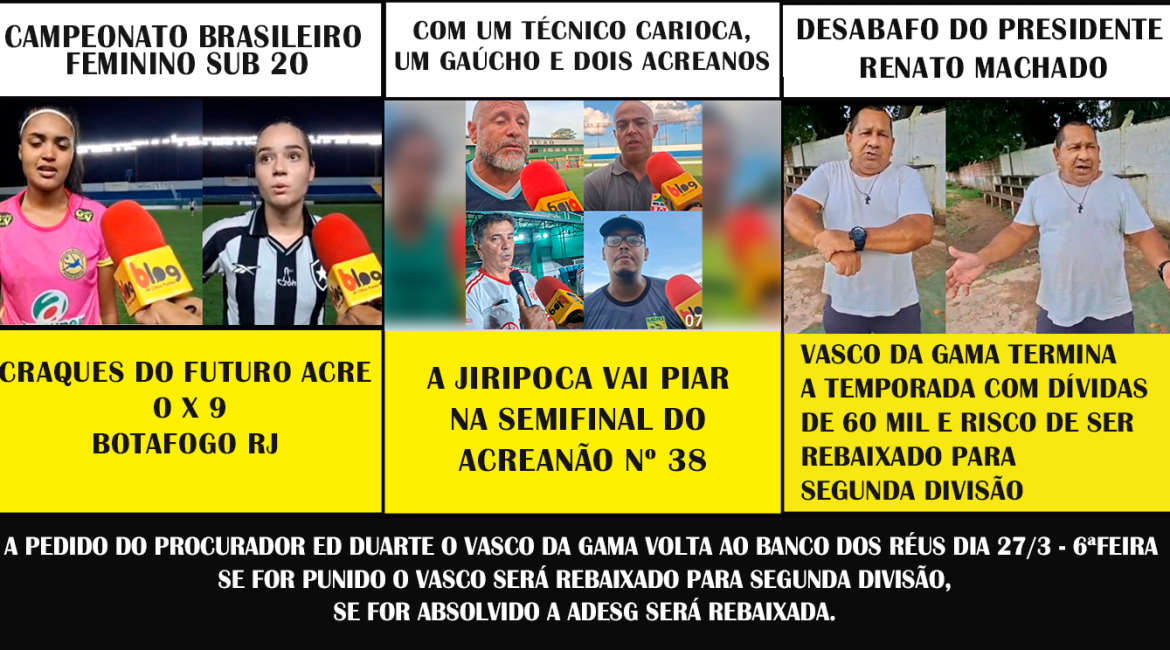CAMPEONATO BRASILEIRO FEMININO SUB 2O, CRAQUES DO FUTURO ACRE O X BOTAFOGO RJ 9 COM UM TÉCNICO CARIOCA,UM GAÚCHO E DOIS ACREANOS, A JIRIPOCA VAI PIAR NA SEMIFINAL DO ACREANÃO N.38 DESABAFO DO PRESIDENTE RENATO MACHADO, VASCO DA GAMA TERMINA A TEMPORADA COM DÍVIDAS DE 6O MIL E RISCO DE SER REBAIXADO PARA…