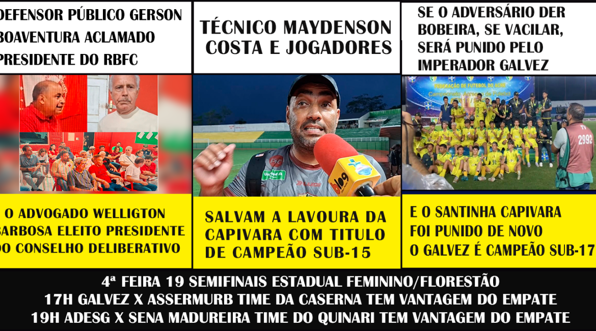 DEFENSOR PÚBLICO GERSON BOAVENTURA ACLAMADO PRESIDENTE DO RBFC E O ADVOGADO WELLIGTON BARBOSA ELEITO PRESIDENTE DO CONSELHO DELIBERATIVO TÉCNICO MAYDENSON COSTA E JOGADORES SALVAM A LAVOURA DA CAPIVARA COM TITULO DE CAMPEÃO SUB 15 SE O ADVERSÁRIO DER BOBEIRA, SE VACILAR, SERÁ PUNIDO PELO IMPERADOR GALVEZ, E O SANTINHA CAPIVARA FOI PUNIDO DE NOVO O…