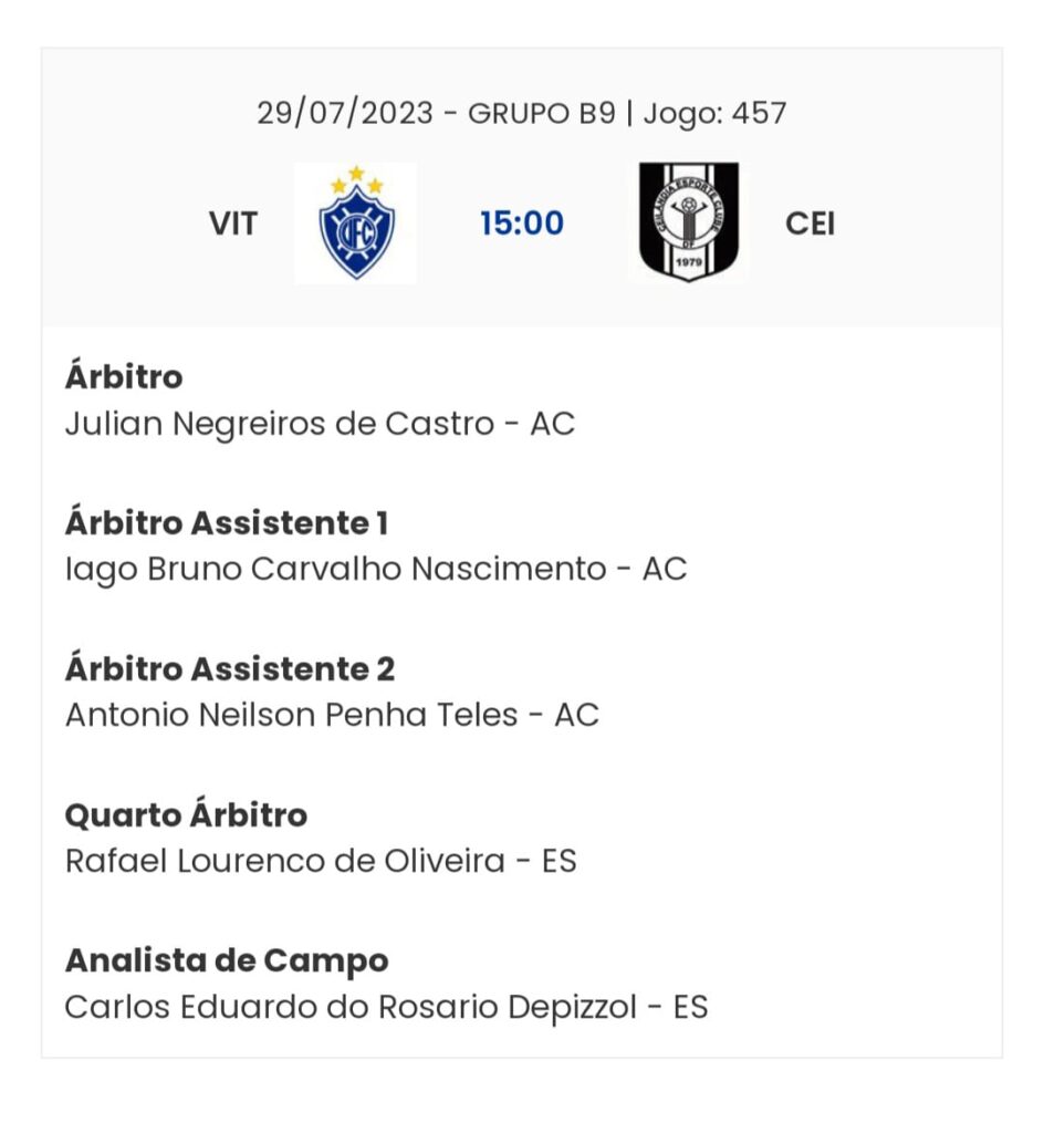 A CBF escalou trio acreano para apitar o jogo mata-mata n. 457, Serie D, sábado 29/7 no Estádio Salvador Costa na Capital Capixaba. Veja a Escala: