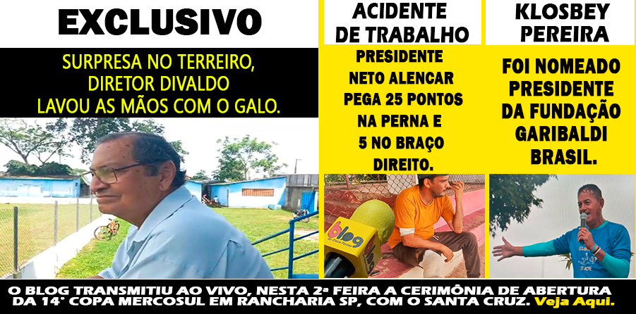 EXCLUSIVO SURPRESA NO TERREIRO, DIRETOR DIVALDO LAVOU AS MÃOS COM O GALO. ACIDENTE DE TRABALHO PRESIDENTE NETO ALENCAR PEGA 25 PONTOS NA PERNA E 5 NO BRAÇO DIREITO. O BLOG TRANSMITIU AO VIVO, NESTA 2ª FEIRA A CERIMÔNIA DE ABERTURA DA 14° COPA MERCOSUL EM RANCHARIA SP, COM O SANTA CRUZ. Veja Aqui: KLOSBEY PEREIRA…