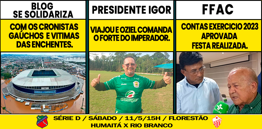 BLOG SE SOLIDARIZA COM OS CRONISTAS GAÚCHOS E VITIMAS DAS ENCHENTES. PRESIDENTE IGOR VIAJOU E OZIEL COMANDA O FORTE DO IMPERADOR. FFAC CONTAS EXERCICIO 2023 APROVADA FESTA REALIZADA.