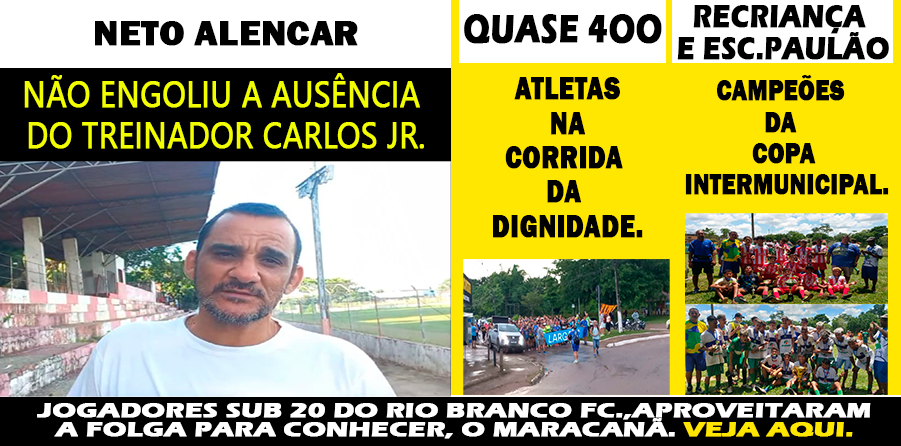 NETO ALENCAR NÃO ENGOLIU A AUSÊNCIA DO TREINADOR CARLOS JR. QUASE 4OO ATLETAS NA CORRIDA DA DIGNIDADE. RECRIANÇA E ESC.PAULÃO CAMPEÕES DA COPA INTERMUNICIPAL. JOGADORES SUB 20 DO RIO BRANCO FC., APROVEITARAM A FOLGA PARA CONHECER, O MARACANÃ.