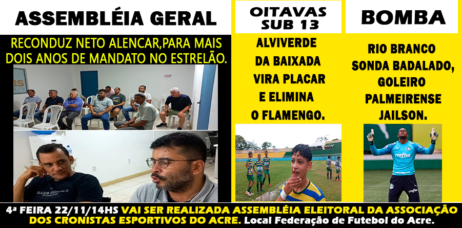 ASSEMBLÉIA GERAL RECONDUZ NETO ALENCAR, PARA MAIS DOIS ANOS DE MANDATO NO ESTRELÃO. OITAVAS SUB 13 ALVIVERDE DA BAIXADA VIRA PLACAR E ELIMINA O FLAMENGO. BOMBA RIO BRANCO SONDA BADALADO, GOLEIRO PALMEIRENSE JAILSON.