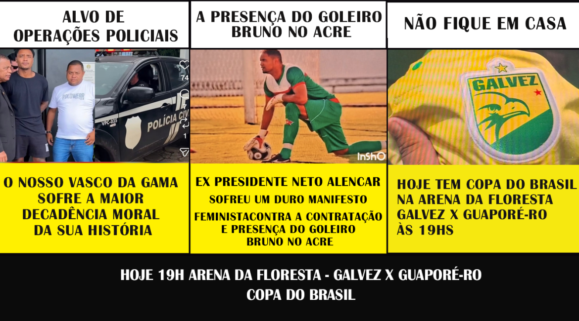 ALVO DE OPERAÇÕES POLICIAIS O NOSSO VASCO DA GAMA SOFRE A MAIOR DECADÊNCIA MORAL DA SUA HISTÓRIA A PRESENÇA DO GOLEIRO BRUNO NO ACRE EX PRESIDENTE NETO ALENCAR SOFREU UM DURO MANIFESTO FEMINISTA CONTRA A CONTRATAÇÃO E PRESENÇA DO GOLEIRO BRUNO NO ACRE NÃO FIQUE EM CASA HOJE TEM COPA DO BRASIL…
