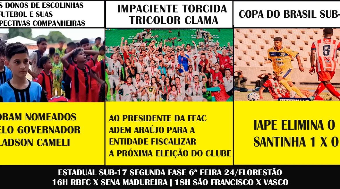 TRES DONOS DE ESCOLINHAS DE FUTEBOL E SUAS RESPECTIVAS COMPANHEIRAS FORAM NOMEADOS PELO GOVERNADOR GLADSON CAMELI IMPACIENTE TORCIDA TRICOLOR CLAMA AO PRESIDENTE DA FFAC ADEM ARAÚJO PARA A ENTIDADE FISCALIZAR A PRÓXIMA ELEIÇÃO DO CLUBE COPA DO BRASIL SUB-2O, IAPE ELIMINA O SANTINHA 1 X O