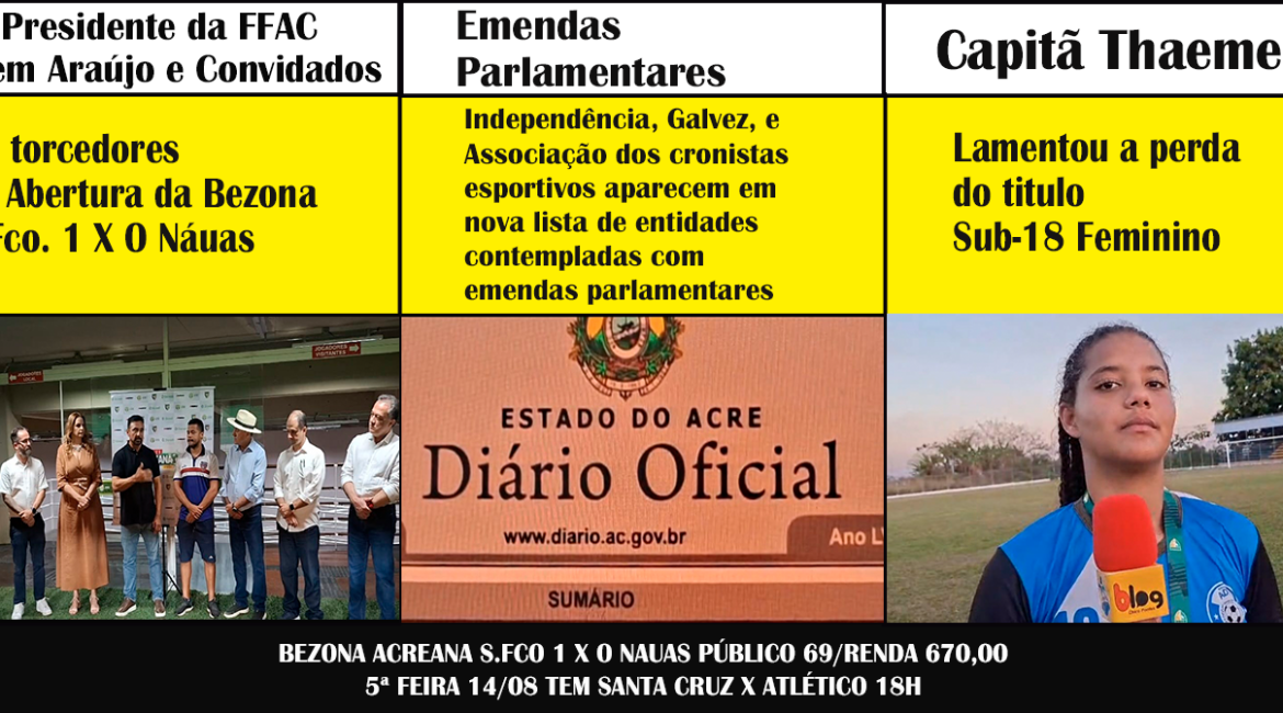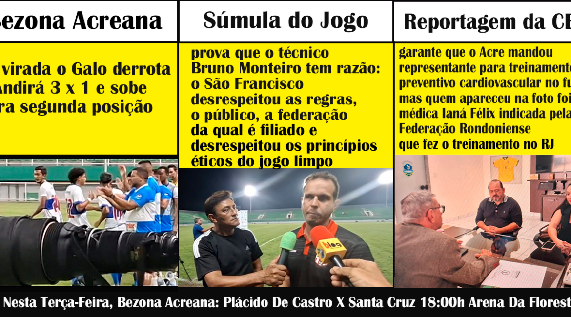 Bezona Acreana de virada o galo derrota o Andirá 3 x 1 e sobe para segunda posição Súmula do jogo prova que o técnico Bruno Monteiro tem razão o São Francisco desrespeitou as regras, o público, a federação da qual é filiado e desrespeitou os princípios éticos do jogo limpo Reportagem da CBF garante que o Acre mandou…
