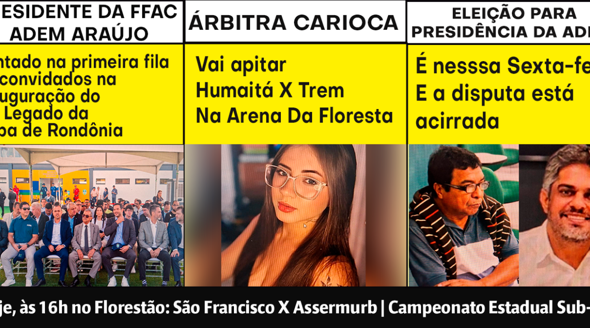 PRESIDENTE DA FFAC ADEM ARAÚJO – Sentado na primeira fila de convidados na Inauguração do CD Legado da Copa de Rondônia ÁRBITRA CARIOCA VAI APITAR HUMAITÁ X TREM NA ARENA DA FLORESTA ELEIÇÃO PARA PRESIDÊNCIA DA ADESG É NESSSA SEXTA-FEIRA E A DISPUTA ESTÁ ACIRRADA