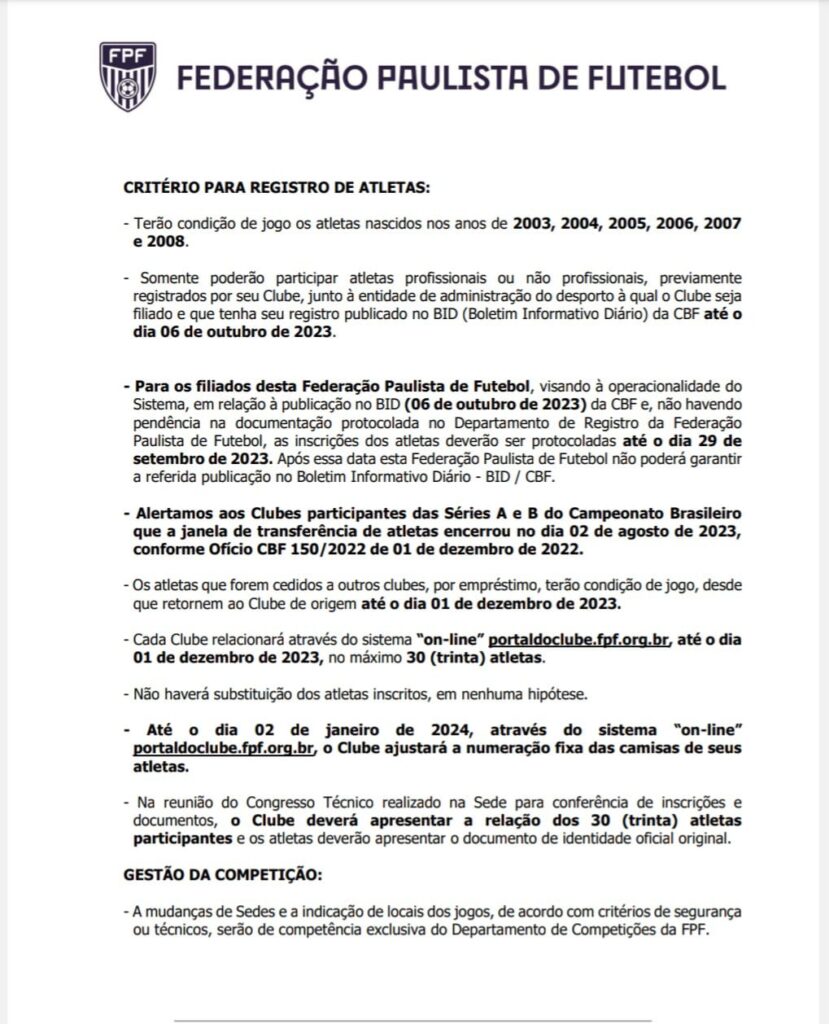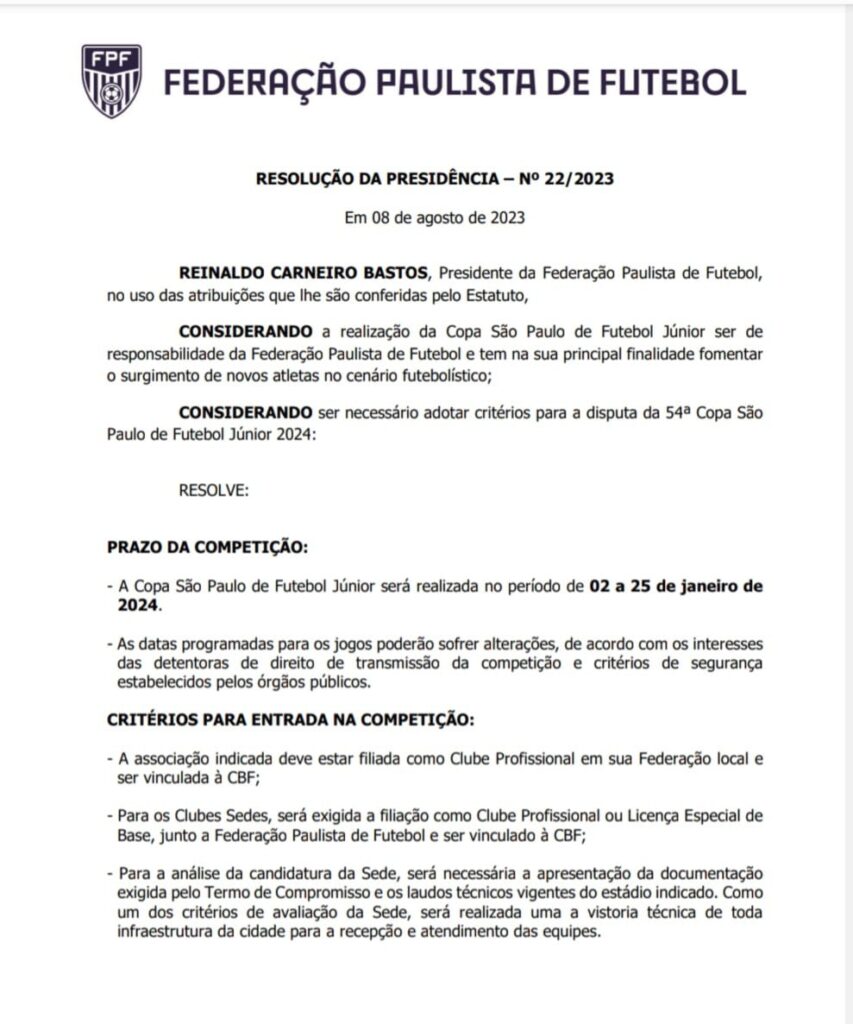 Nesta 3ª Feira 8/8 a Federação Paulista de Futebol, divulgou os critérios para disputa da Copa São Paulo Jr. Conforme a resolução, A ASSOCIAÇÃO INDICADA DEVE SER FILIADA COMO CLUBE PROFISSIONAL, EM SUA FEDERAÇÃO LOCAL E SER VINCULADA À CBF. Como o time Sena Madureira Campeão Acreano Sub 20/2023, não tem Filiação Profissional na FFAC, não tem direito a vaga na Copinha. Assim o Vice Campeão Sub 20, Rio Branco F.C, será o representante do Acre na 54° Copa São Paulo Jr. Veja os documentos publicados pela Federação Paulista nesta terça 8/8.