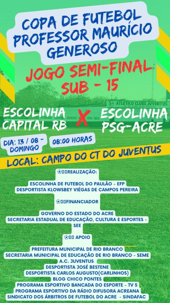 Domingo 13/8 8 da manhã o C.T. DO Juventus vai ser palco de mais uma decisão. Escolinha Capital RB e Escolinha PSG Acre vão lutar por uma vaga na semifinal da Copa Mauricio Generoso. A coordenação da competição é da Escolinha do Paulão e Desportista Klosbey Pereira. Veja a reportagem: