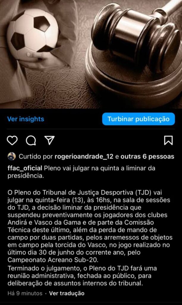 O Tribunal de Justiça Desportiva do Acre, divulgou nota nas redes sociais, confirmando a realização do julgamento para 5ª Feira 13/7. Atletas e integrantes de Comissão Técnica, de Vasco e Andirá, relatados na na súmula pelo árbitro Fábio Santos serão julgadas. Veja a Nota: