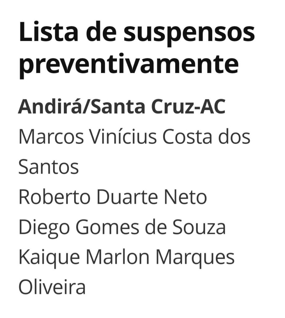 Na tarde desta 5ª Feira 13/5 O Tribunal de Justiça Desportiva do Acre, julgou o mérito da liminar que suspendeu preventivamente por 30 dias, jogadores e comissão técnica, envolvidos em agressões no jogo Vasco x Andirá pelo Estadual Sub 20. O árbitro Fábio Santos relatou os seguintes nomes na súmula: