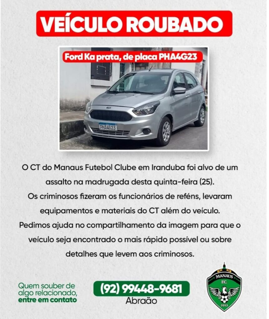 Na madrugada desta 5ª Feira 25/5 assaltantes invadiram o Centro de Treinamento do MANAUS SÉRIE C em Iranduba, levaram um carro e material de treinamento dos jogadores. A Diretoria do Manaus, publicou esta nota: